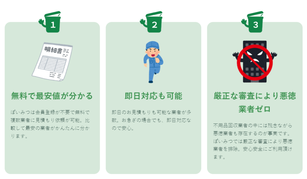 ぽいみつは、不用品回収や遺品整理の業者選びで失敗したくない人に最適な一括見積もりサービスです。審査済みの優良業者のみが登録されており、複数社を比較することで最安値を見つけられます。