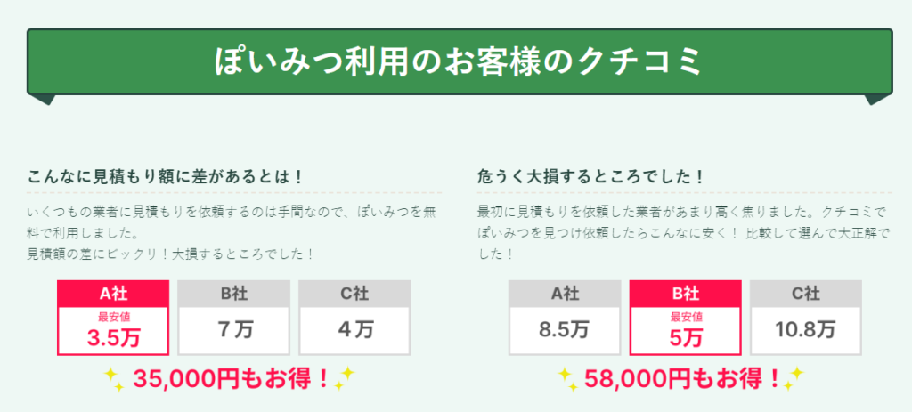 結論から言うと、ぽいみつは審査済みの優良業者のみが登録されている一括見積もりサービスで、複数社を比較することで料金を2万円〜20万円以上抑えられた事例が多数報告されています。