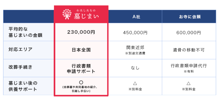 「わたしたちの墓じまい」と他社サービスを比較すると、いくつかの違いが浮かび上がります。